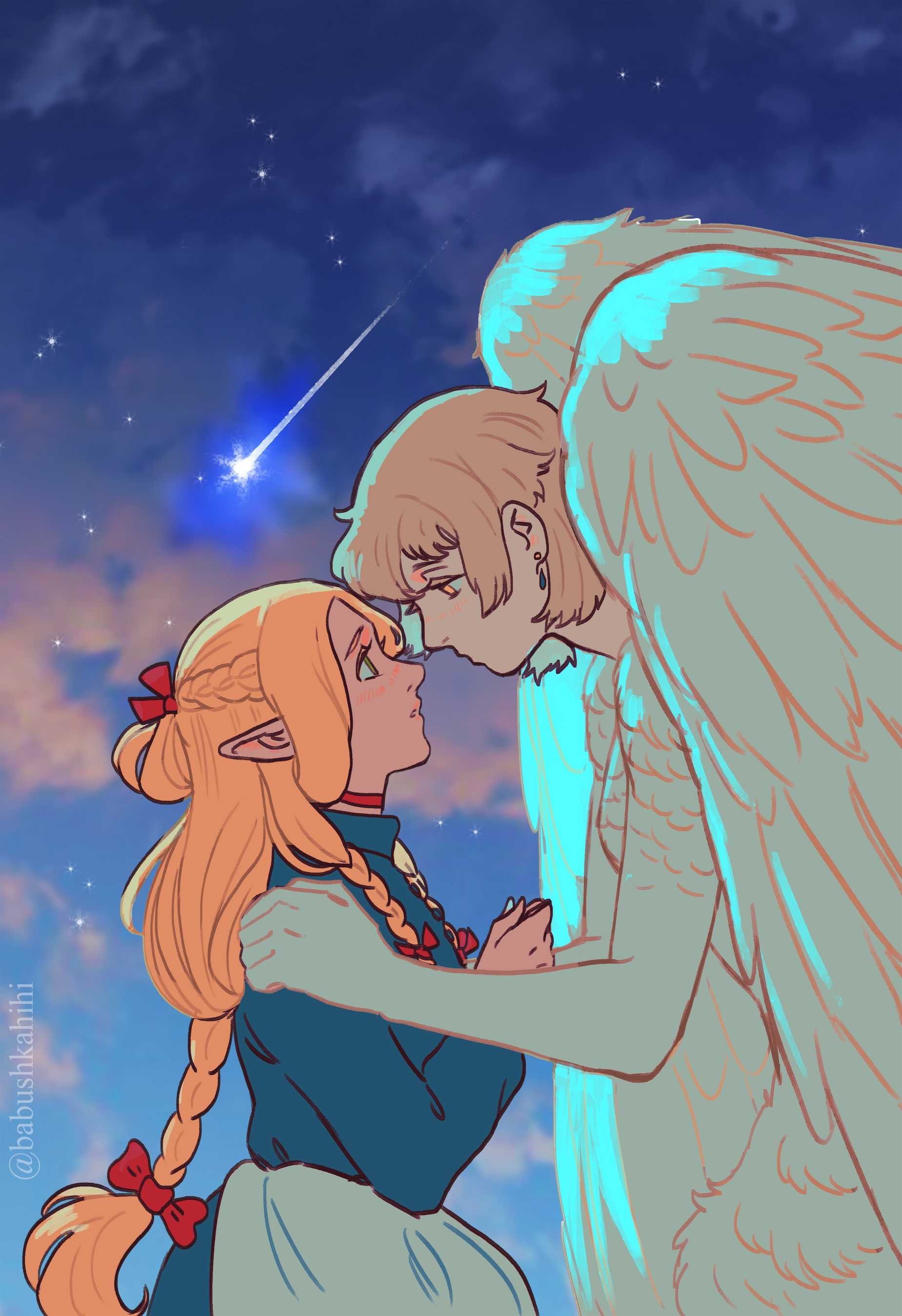 2girls absurdres babu_(babushkahihi) blonde_hair blue_dress bow braid chimera choker dragon_girl dress dungeon_meshi earrings elf falin_touden falin_touden_(chimera) feathered_wings feathers green_eyes hands_on_another's_shoulders hashtag-only_commentary highres howl_no_ugoku_shiro light_brown_hair long_hair looking_at_another marcille_donato medium_hair monster_girl multiple_girls own_hands_together parody parted_lips pointy_ears ponytail red_bow red_choker shooting_star teardrop_earrings twin_braids twitter_username very_long_hair wings yellow_eyes yuri