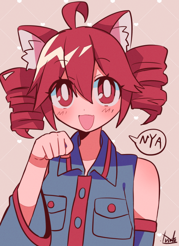 animal_ears blush buttons cat_ears close-up collared_shirt detached_sleeves double-parted_bangs drill_hair hair_between_eyes hand_up kasane_teto kasane_teto_(utau) long_sleeves looking_at_viewer open_mouth pink_background pocket red_eyes red_hair shirt signature sleeveless sleeveless_shirt speech_bubble twin_drills utau wing_collar yuusuke-kun