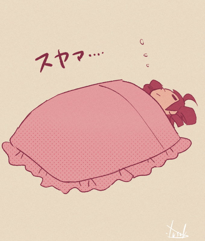 1girl ahoge blanket closed_eyes closed_mouth drill_hair futon invisible_floor kasane_teto lying nose red_hair signature simple_background sleeping solo twin_drills utau white_background yuusuke-kun