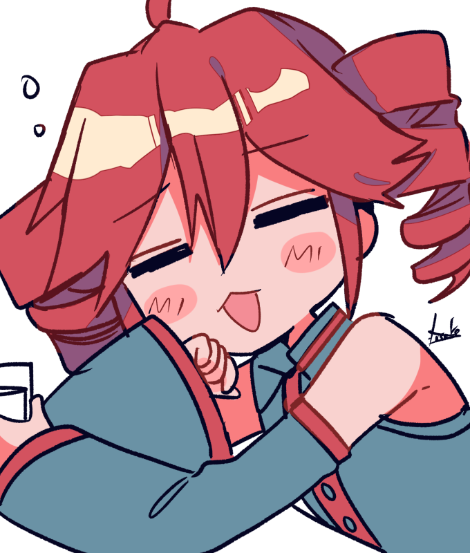 ahoge black_shirt black_sleeves blush buttons cup detached_sleeves double-parted_bangs drill_hair drink drunk hair_between_eyes head_rest kasane_teto kasane_teto_(utau) long_sleeves open_mouth red_hair red_trim shirt signature sleeveless sleeveless_shirt table twin_drills utau yuusuke-kun