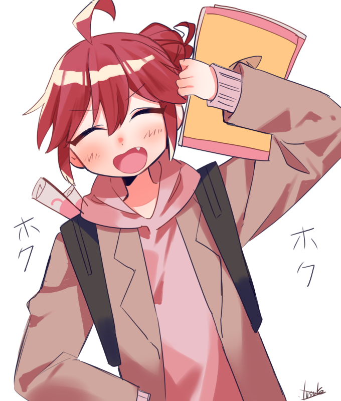 ahoge alternate_costume alternate_hairstyle arm_up bag blush brown_jacket double-parted_bangs fang hair_between_eyes holding holding_notebook hood hooded_sweater jacket kasane_teto notebook open_clothes open_jacket open_mouth pink_sweater red_hair signature simple_background sweater tongue utau white_background yuusuke-kun