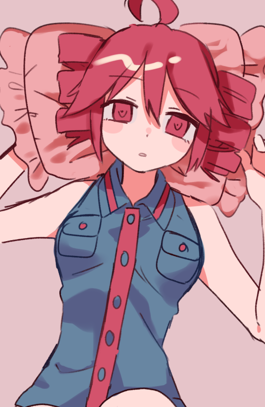 1girl :o ahoge bed black_shirt blush buttons collared_shirt double-parted_bangs drill_hair frilled_pillow frills hair_between_eyes hands_up kasane_teto kasane_teto_(utau) looking_at_viewer lying on_back pillow pocket red_eyes red_hair red_trim shirt sleeveless sleeveless_shirt solo twin_drills upper_body utau yuusuke-kun