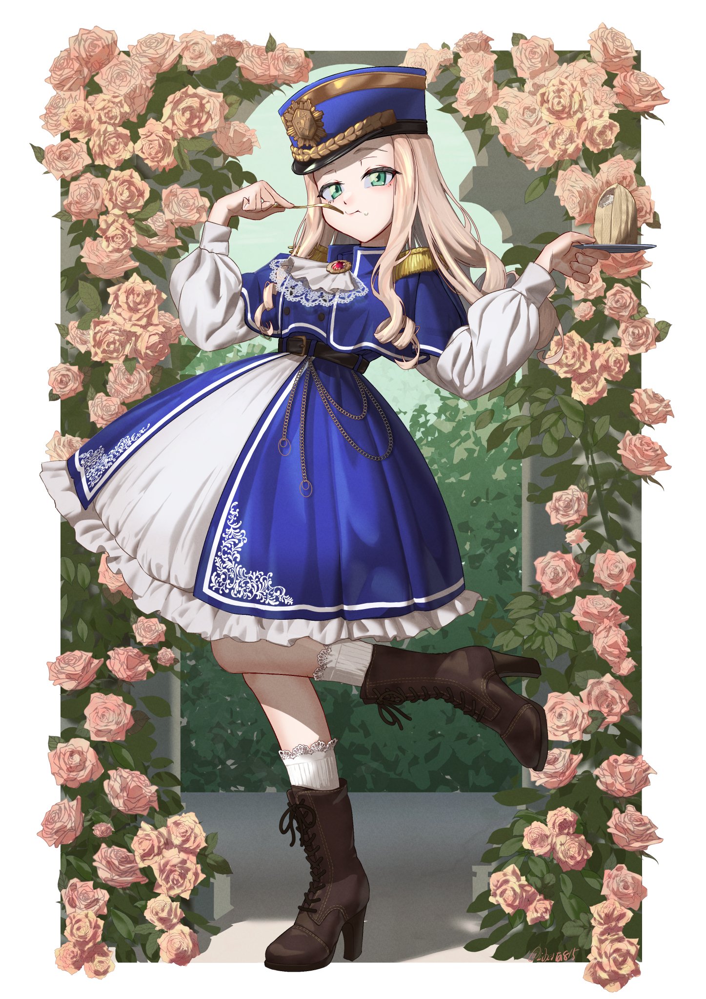 1girl accurate_lolita_coord adapted_costume blonde_hair blue_capelet blue_dress blue_hat capelet dress eating epaulettes flower food girls_und_panzer green_eyes hat highres hime_cut liberta815 lolita_fashion looking_at_viewer marie_(girls_und_panzer) military_hat military_lolita military_uniform mont_blanc_(food) shirt solo standing standing_on_one_leg two-tone_dress white_shirt