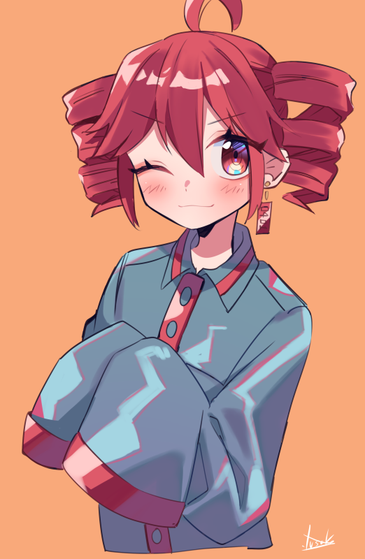 1girl ahoge alternate_costume blush buttons closed_mouth collared_shirt double-parted_bangs drill_hair hair_between_eyes kasane_teto kasane_teto_(utau) long_sleeves one_eye_closed orange_background red_eyes red_hair red_trim shirt signature simple_background smile solo twin_drills upper_body utau wing_collar yuusuke-kun