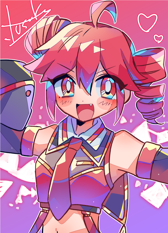 1girl ahoge alternate_costume alternate_hairstyle black_sleeves blush collared_shirt detached_sleeves double-parted_bangs drill_hair fang hair_between_eyes hands_up heart kasane_teto midriff multicolored_background necktie open_mouth pink_background purple_background red_background red_eyes red_hair red_necktie red_shirt shirt side_drill signature sleeveless sleeveless_shirt solo tongue utau very_long_sleeves wing_collar yuusuke-kun