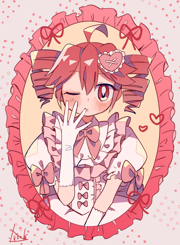 ;o adjusting_clothes ahoge border bow bowtie double-parted_bangs dress drill_hair frilled_dress frills gloves hair_between_eyes hair_ornament heart heart_hair_ornament kasane_teto one_eye_closed ornate_border pink_background pink_bow pink_dress red_eyes red_hair signature twin_drills utau white_gloves yuusuke-kun