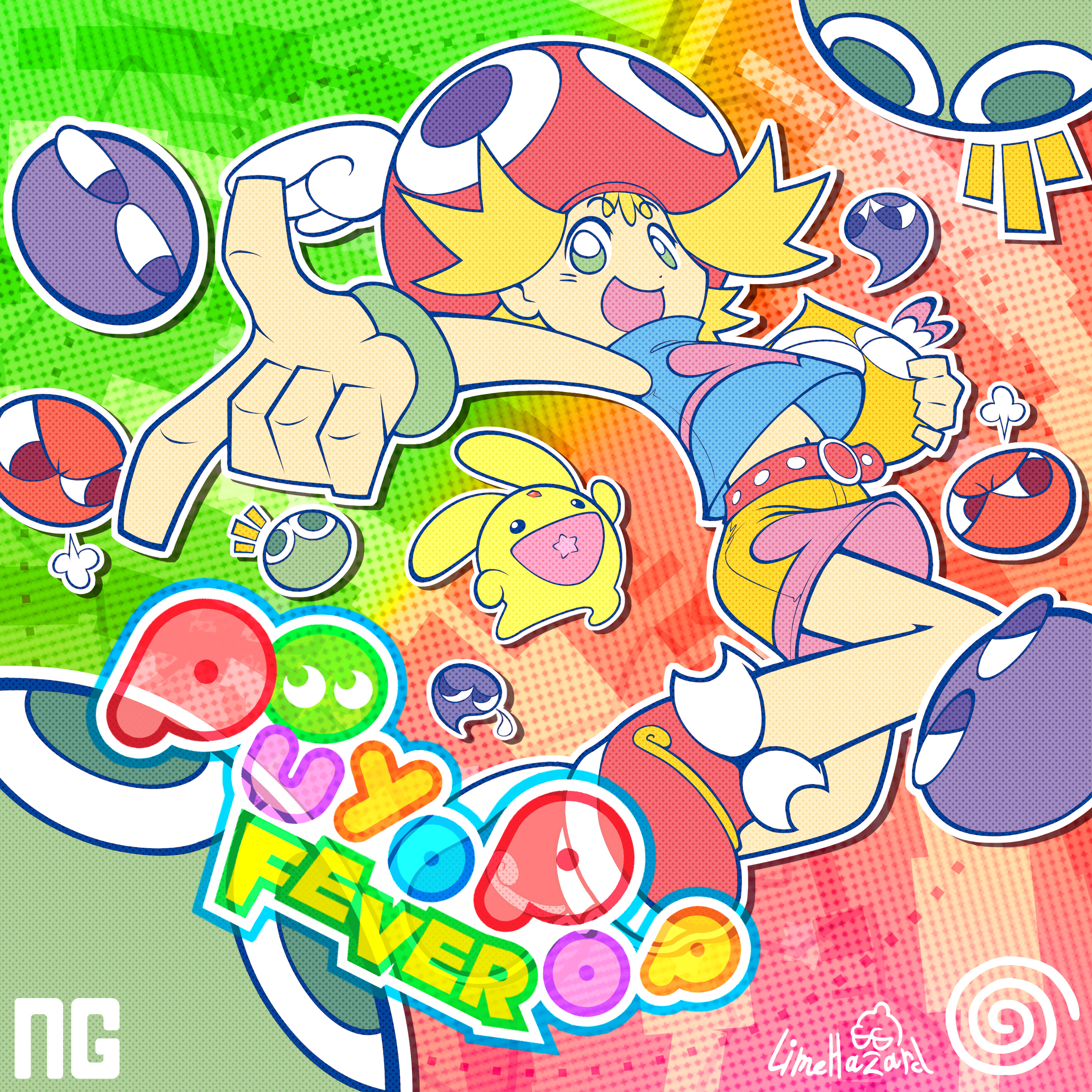 1girl absurdres amitie_(puyopuyo) artist_name belt blonde_hair blue_shirt carbuncle_(puyopuyo) character_hat copyright_name creature dot_nose flipped_bangs foreshortening full_body gradient_background green_eyes halftone halftone_background hand_up happy hat highres holding holding_creature knees_up l_hand limehazard looking_at_viewer looking_to_the_side midriff_peek multicolored_background navel official_style open_mouth outline puyo_(puyopuyo) puyopuyo puyopuyo_fever red_belt red_footwear red_hat shirt sideways_glance sleeveless sleeveless_shirt solo turtleneck turtleneck_shirt two-tone_shorts white_outline winged_hat wristband