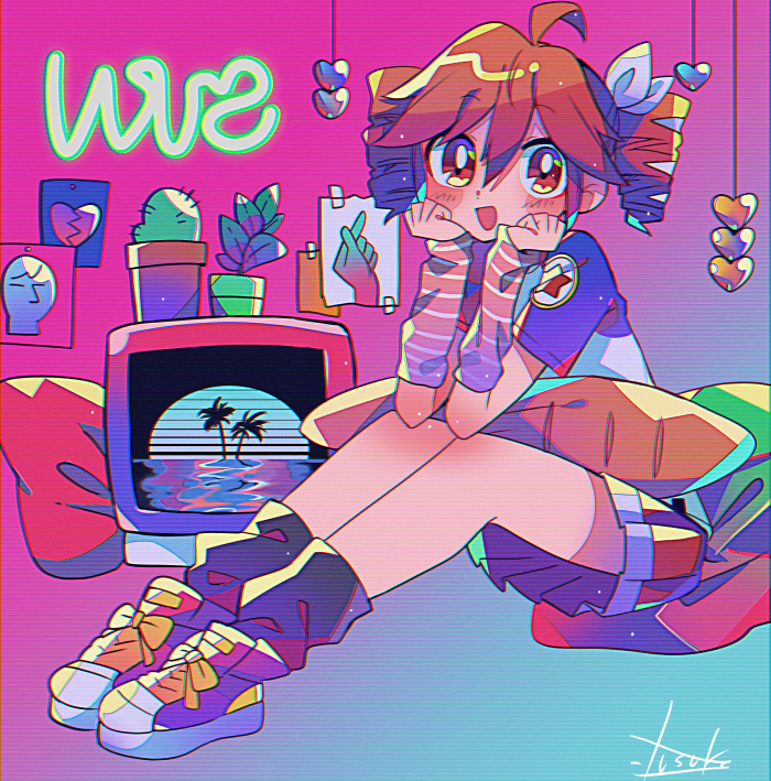 :o ahoge alternate_costume blue_sleeves blush cactus detached_sleeves double-parted_bangs drill_hair finger_heart hair_between_eyes head_rest index_finger_raised kasane_teto kasane_teto_(sv) kneehighs open_mouth pillow plant pleated_skirt poster_(object) red_hair shirt shoes short_sleeves sitting skirt socks striped_sleeves synthesizer_v television twin_drills utau white_shirt yuusuke-kun