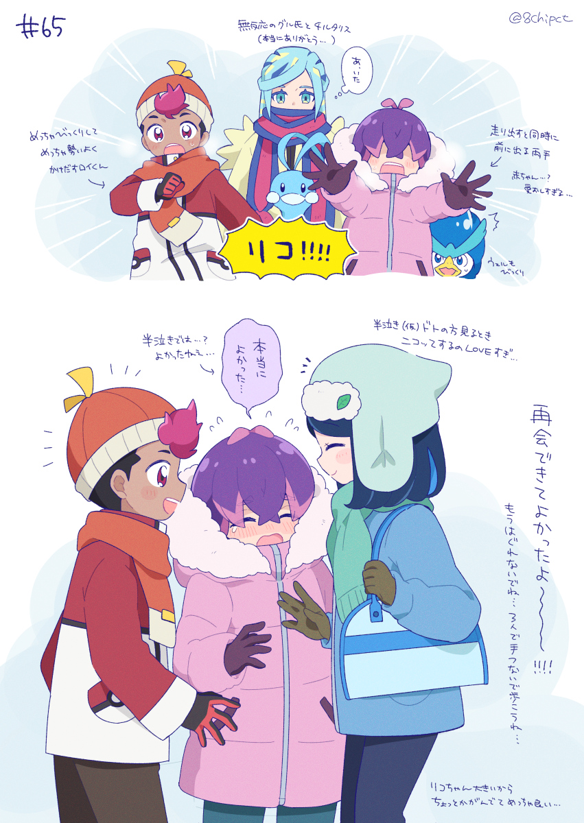 0zr8hc 2boys 2girls :o altaria beanie black_hair black_pants blue_jacket brown_gloves brown_pants clenched_hand closed_eyes coat commentary_request dot_(pokemon) flying_sweatdrops fur-trimmed_hood fur_trim gen_3_pokemon gloves green_hat grusha_(pokemon) hat highres hood jacket liko_(pokemon) long_sleeves multicolored_hair multiple_boys multiple_girls nintendo notice_lines open_mouth pants pink_coat pink_hair pokemon pokemon_(anime) pokemon_horizons purple_hair quaxwell red_hat roy_(pokemon) scarf short_hair smile speech_bubble teeth translation_request two-tone_hair upper_teeth_only