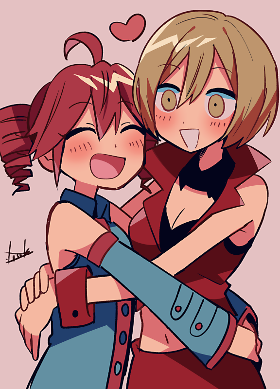 2girls ahoge black_shirt black_sleeves blush brown_eyes brown_hair buttons closed_eyes collared_shirt crop_top detached_collar detached_sleeves double-parted_bangs drill_hair grin hair_between_eyes heart hug jacket kasane_teto kasane_teto_(utau) long_sleeves meiko_(vocaloid) midriff multiple_girls navel open_mouth own_hands_together pink_background red_hair red_jacket red_skirt red_trim red_wrist_cuffs shirt short_hair skirt skirt_set sleeveless sleeveless_jacket sleeveless_shirt smile stomach tongue twin_drills utau vocaloid wing_collar wrist_cuffs yuusuke-kun