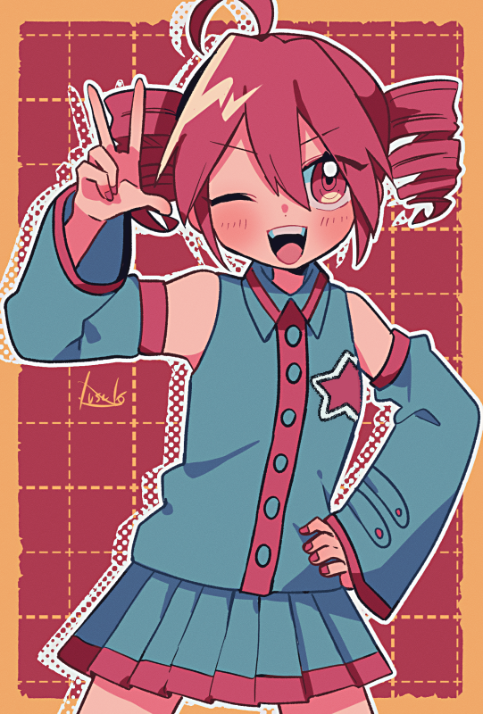 1girl ahoge black_shirt black_sleeves buttons collared_shirt cowboy_shot detached_sleeves double-parted_bangs drill_hair fingernails hair_between_eyes hand_on_own_hip hand_up kasane_teto kasane_teto_(utau) long_sleeves miniskirt one_eye_closed pleated_skirt red_background red_eyes red_hair red_nails shirt signature skirt skirt_set sleeveless sleeveless_shirt solo teeth tongue twin_drills upper_teeth_only utau w wing_collar yuusuke-kun