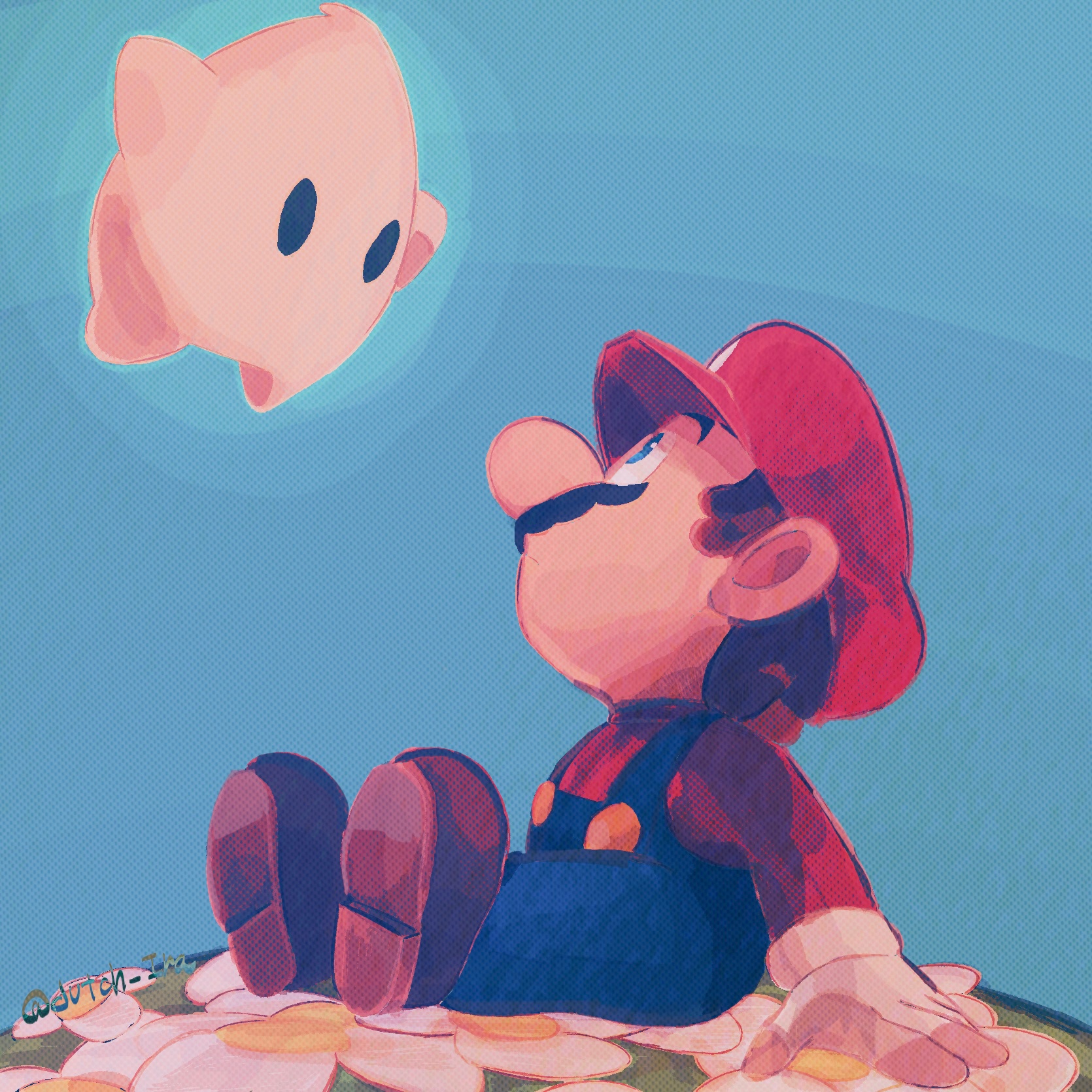 1boy baby_luma black_eyes blue_eyes blue_overalls brown_footwear dutch_ira facial_hair flower gloves highres long_hair luma_(mario) male_focus mario mario_(series) mustache nintendo overalls super_mario_galaxy white_gloves