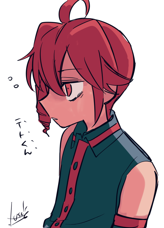1girl ahoge alternate_hairstyle black_shirt black_sleeves clenched_teeth collared_shirt detached_sleeves drill_hair kasane_teto kasane_teto_(utau) one_eye_covered red_eyes red_hair shirt side_drill signature sleeveless solo teeth utau wing_collar yuusuke-kun