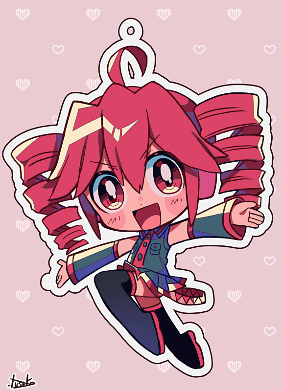 1girl ahoge arm_up black_footwear black_shirt black_skirt black_sleeves black_thighhighs blush buttons chibi chibi_only detached_sleeves double-parted_bangs drill_hair full_body hair_between_eyes kasane_teto kasane_teto_(utau) long_sleeves open_mouth pink_background pleated_skirt red_eyes red_hair red_trim shirt skirt skirt_set sleeveless sleeveless_shirt solo thighhighs tongue twin_drills utau yuusuke-kun zettai_ryouiki