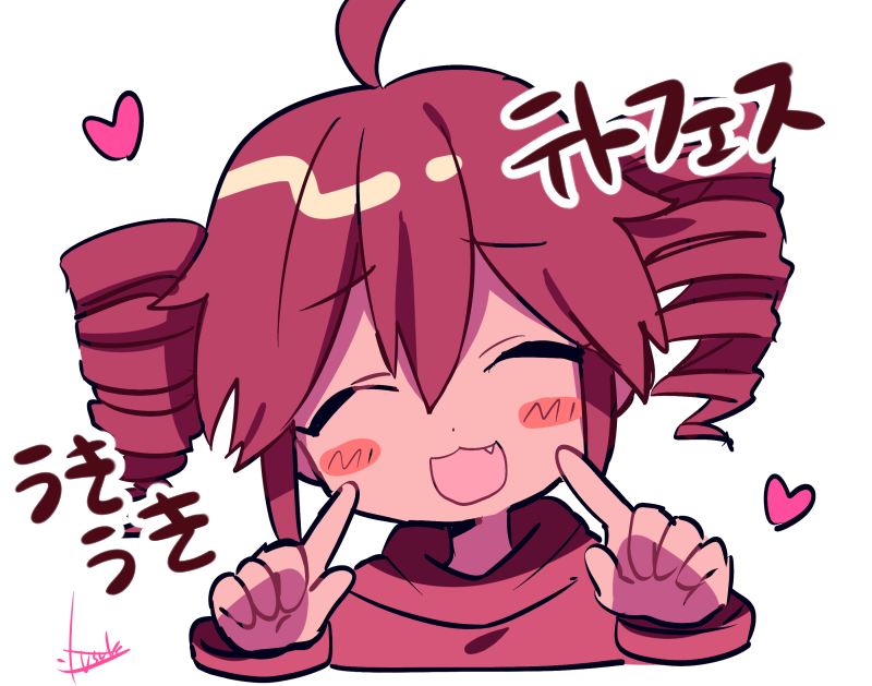 1girl ahoge blush close-up closed_eyes double-parted_bangs drill_hair fang hair_between_eyes heart index_finger_raised kasane_teto open_mouth red_hair red_sweater signature solo sweater twin_drills utau yuusuke-kun