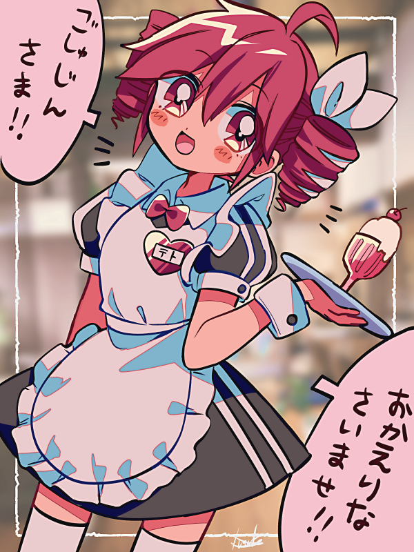 1girl ahoge alternate_costume apron black_dress bow bowtie commentary_request cup dessert disposable_cup disposable_ice_cream_cup double-parted_bangs dress drill_hair food frilled_apron frills hair_between_eyes hair_bow hair_ribbon ice_cream indoors kasane_teto kasane_teto_(sv) plate red_bow red_bowtie red_hair ribbon solo speech_bubble synthesizer_v thighhighs thought_bubble translation_request twin_drills utau white_apron white_bow white_ribbon white_thighhighs white_trim white_wrist_cuffs wrist_cuffs yuusuke-kun zettai_ryouiki