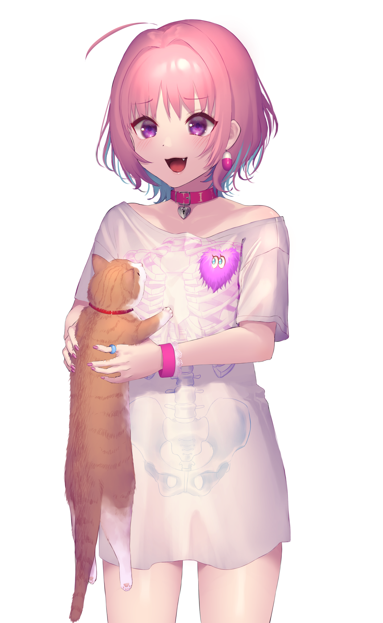 1girl ahoge alternate_eye_color animal cat collar collarbone commentary detached_ahoge dot_nose earrings fang foreshortening frilled_wristband heart heart-shaped_lock highres holding holding_animal holding_cat idolmaster idolmaster_cinderella_girls jewelry looking_to_the_side multicolored_hair nail_polish no_pants okazaki_sato open_mouth pill_earrings pink_collar pink_hair pink_nails purple_eyes ring simple_background single_bare_shoulder skeleton_print smile solo thighs two-tone_hair white_background yumemi_riamu
