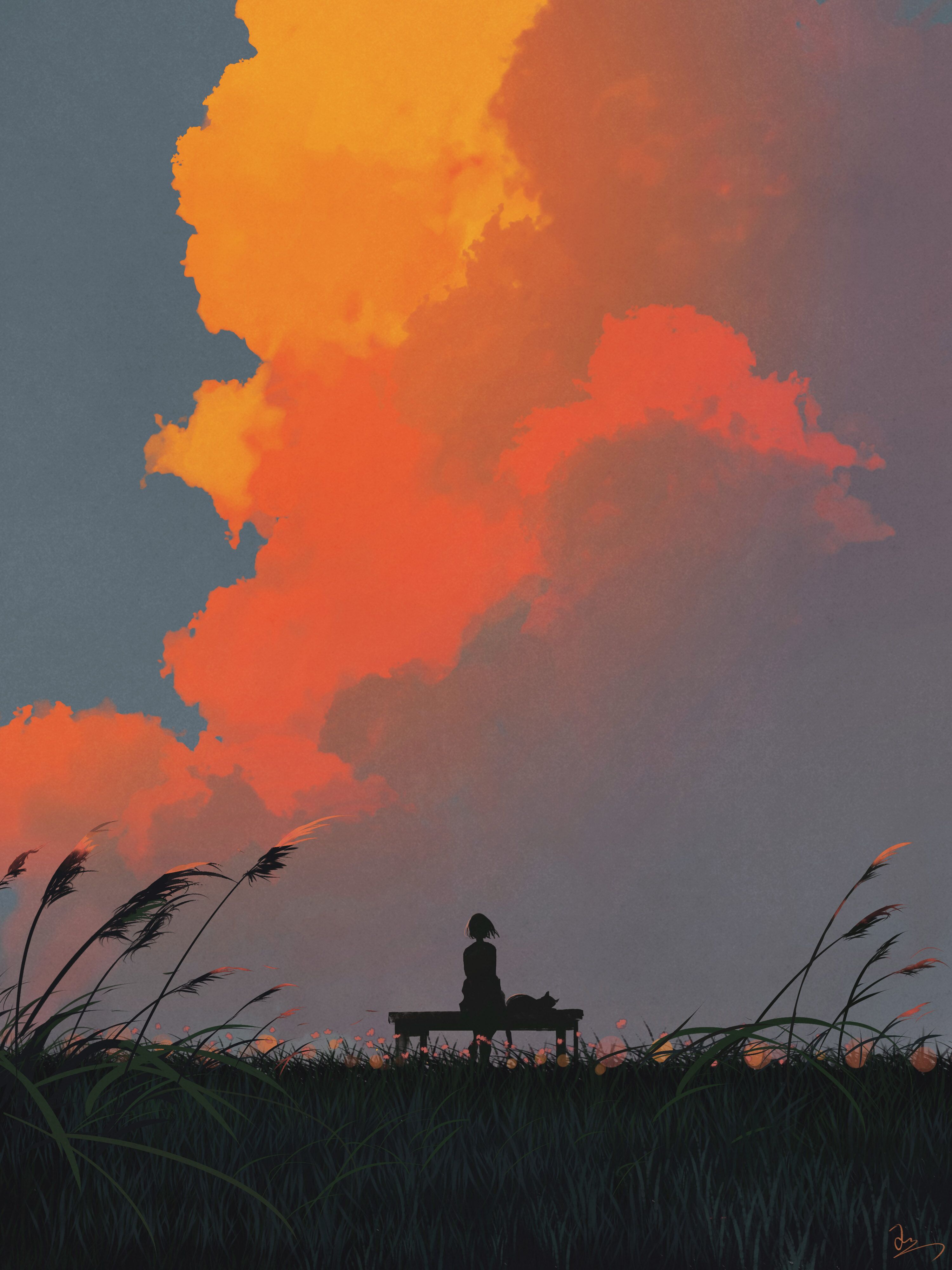 1girl absurdres arms_at_sides bench blue_sky blurry bokeh cat cloud cloudy_sky cumulonimbus_cloud depth_of_field evening facing_away floating_hair from_behind grass highres huashijw landscape nature original outdoors reeds scenery short_hair signature silhouette sitting sky solo very_wide_shot