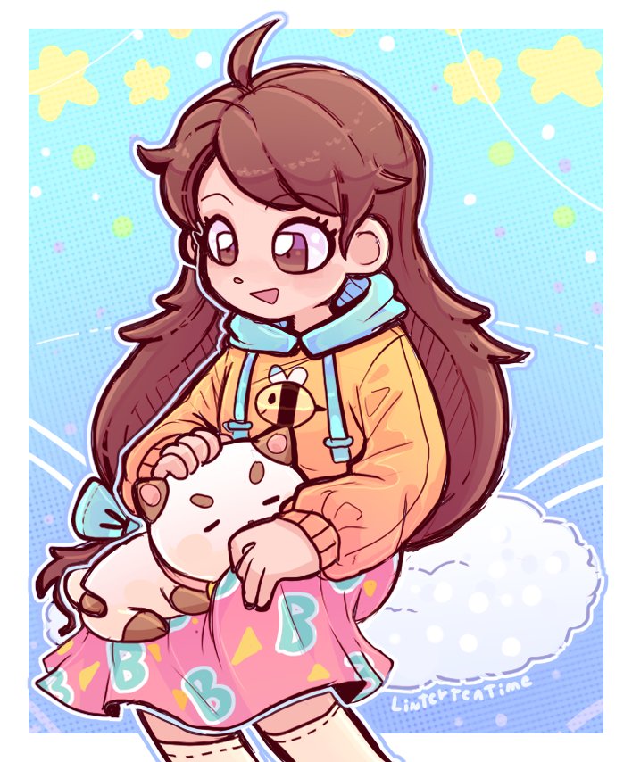 1girl bee_(bee_and_puppycat) bee_and_puppycat bow brown_eyes brown_hair cat cloud linterteatime long_hair long_sleeves looking_at_viewer open_mouth pink_skirt puppycat sitting skirt smile sweater very_long_hair