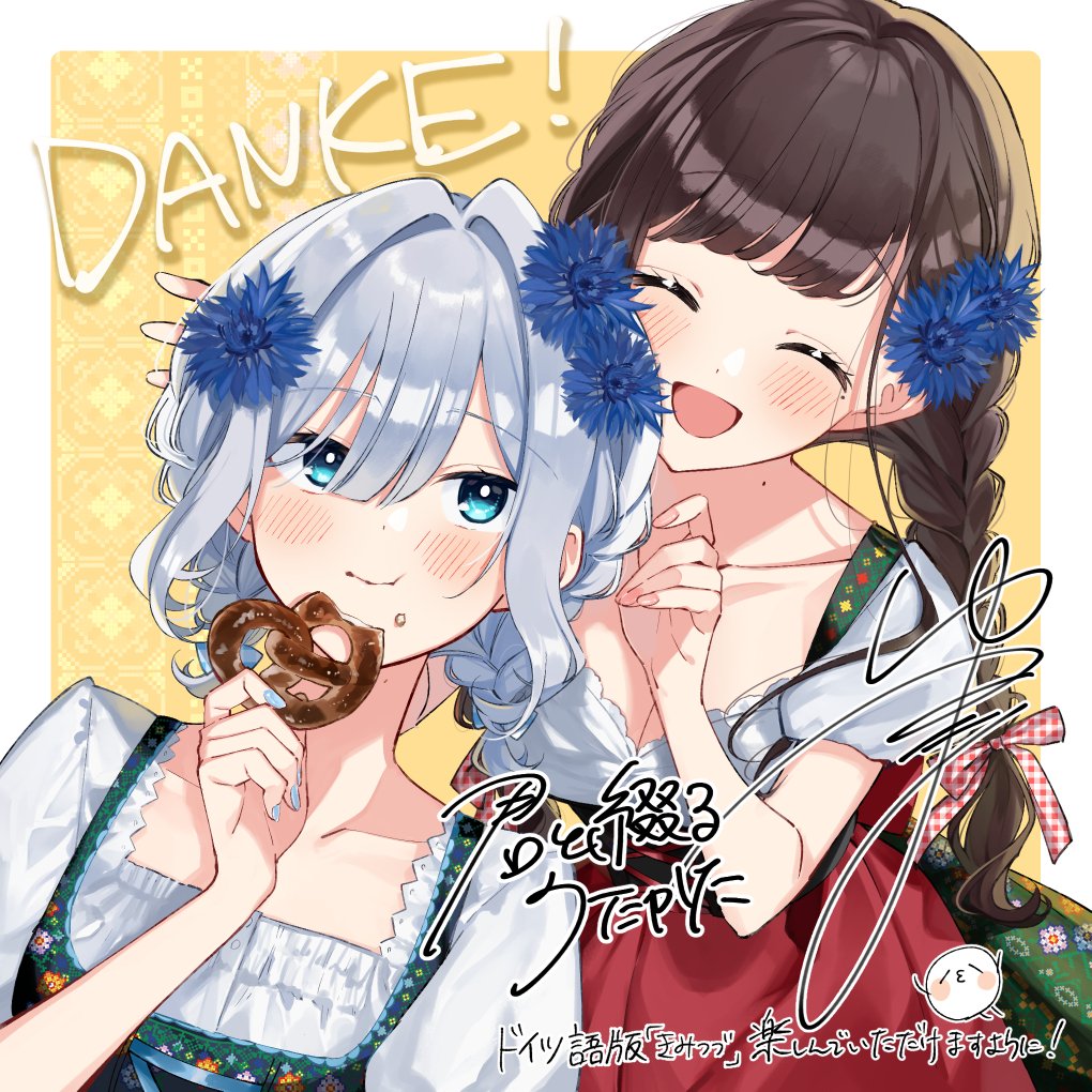2girls ^_^ asaka_kaori blue_eyes blue_flower blush braid brown_hair closed_eyes closed_mouth collarbone commentary_request dress eating flower food food_on_face hair_between_eyes hair_flower hair_ornament hoshikawa_shizuku kimi_to_tsuzuru_utakata long_hair mole mole_on_neck mole_under_eye multiple_girls open_mouth pretzel short_hair single_braid translation_request twin_braids upper_body white_hair yuama