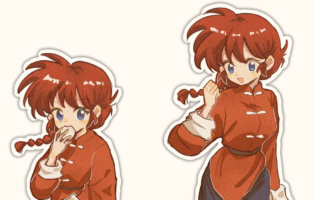 blue_eyes blush_stickers braid breasts chinese_clothes danhuangcucu dumpling eating food happy long_hair open_mouth ranma-chan ranma_1/2 red_hair simple_background tangzhuang white_background