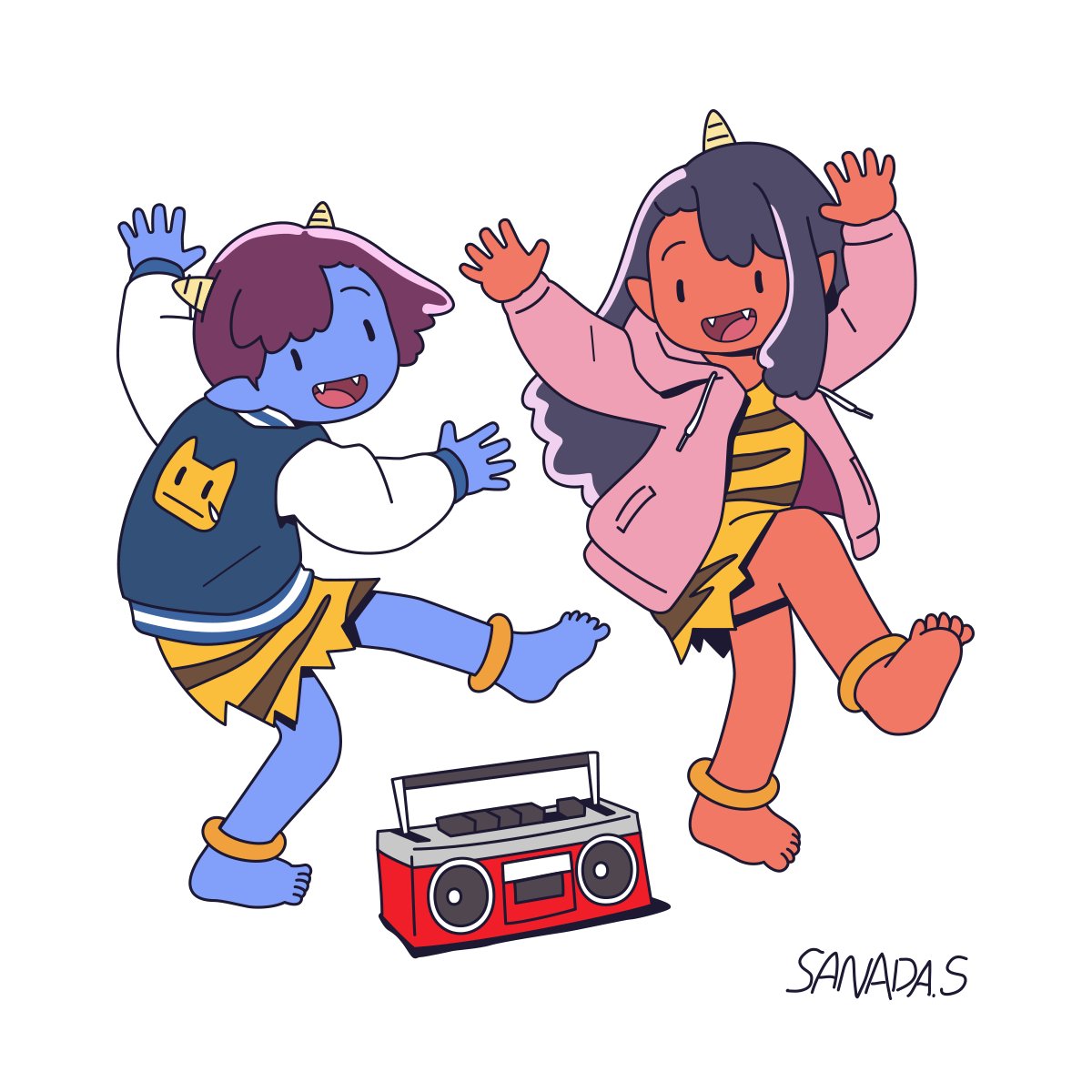 animal_print anklet barefoot bracelet broken_horn colored_skin dancing fangs highres hood hoodie horns jewelry naita_akaoni oni open_mouth red_skin sanada_shin sharp_teeth short_hair smile teeth tiger_print