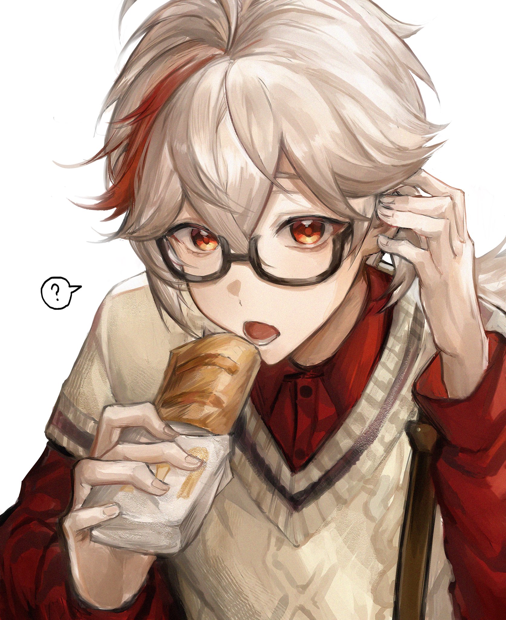 1boy ? bespectacled collared_shirt commentary eating food genshin_impact glasses hair_behind_ear hair_between_eyes highres holding holding_food kaedehara_kazuha kaedehara_kazuha_(mcdonalds) long_sleeves looking_at_viewer male_focus mcdonald's multicolored_hair open_mouth ponytail red_eyes red_hair red_shirt shirt simple_background solo spoken_question_mark streaked_hair sweater_vest untranslatable_commentary tappeee upper_body white_background