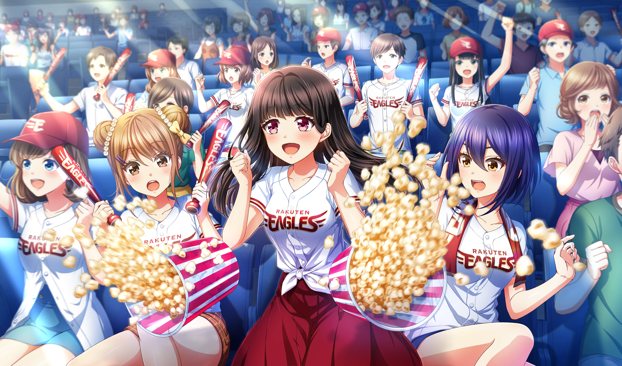 :d baseball_cap baseball_uniform black_hair blue_shorts bow brown_eyes brown_hair brown_shorts cinderella_series clenched_hands double_bun food game_cg hachigatsu_no_cinderella_nine hair_bow hair_bun hat highres light_rays long_hair looking_ahead nagai_kanako nippon_professional_baseball nitta_minako non-web_source official_art open_mouth outdoors popcorn purple_eyes purple_hair red_skirt sakagami_mei shirt short_hair short_sleeves shorts single_sidelock skirt smile sportswear sunbeam sunlight teeth tied_shirt touhoku_rakuten_golden_eagles towel towel_around_neck upper_teeth_only white_shirt yellow_bow