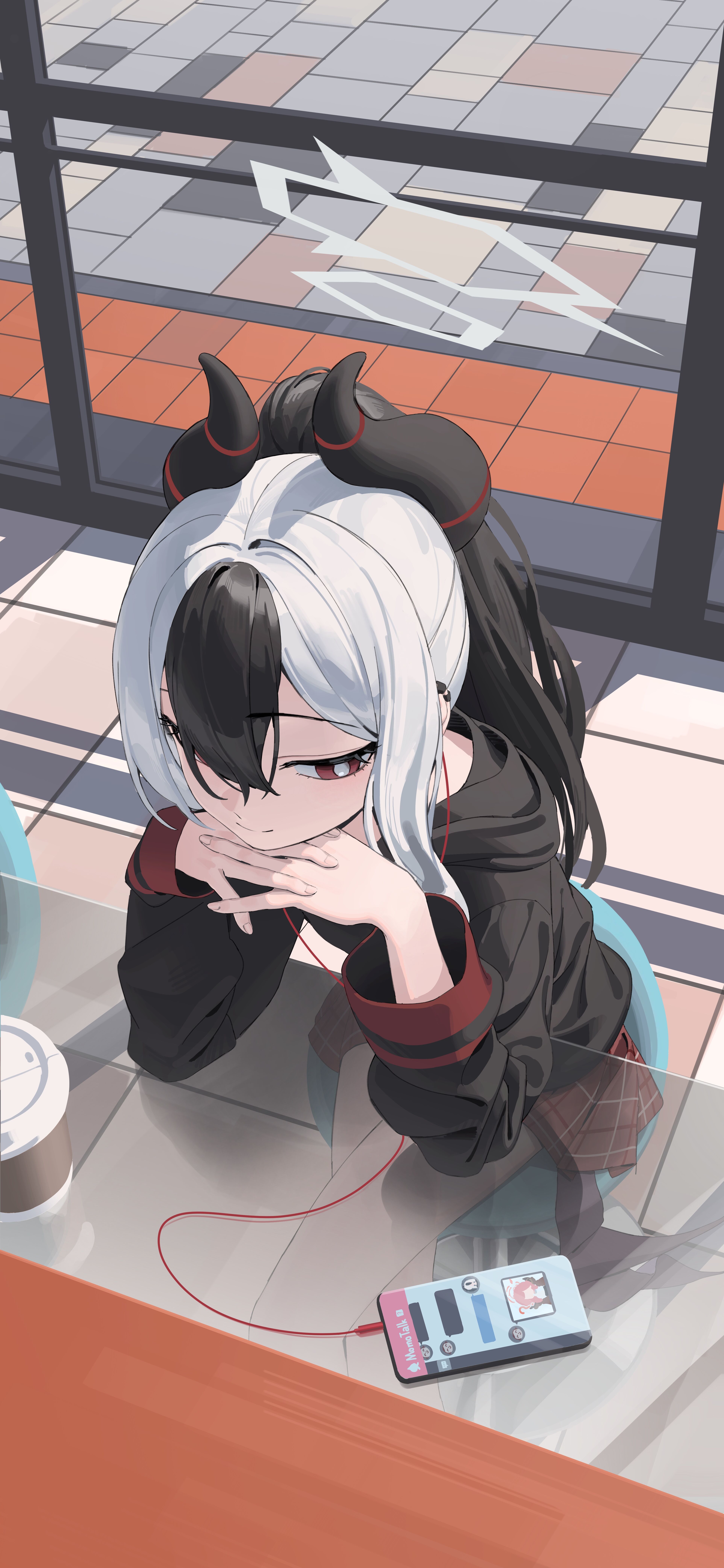 1girl absurdres black_hair black_horns blue_archive cellphone closed_mouth cup demon_horns disposable_coffee_cup disposable_cup earbuds earphones from_above glass_table grey_halo hair_between_eyes halo highres horns kayoko_(blue_archive) long_hair multicolored_hair phone plaid_clothes plaid_skirt red_eyes rui_(rei_leyi) shadow sitting skirt smartphone smile solo stool table two-tone_hair white_hair wings