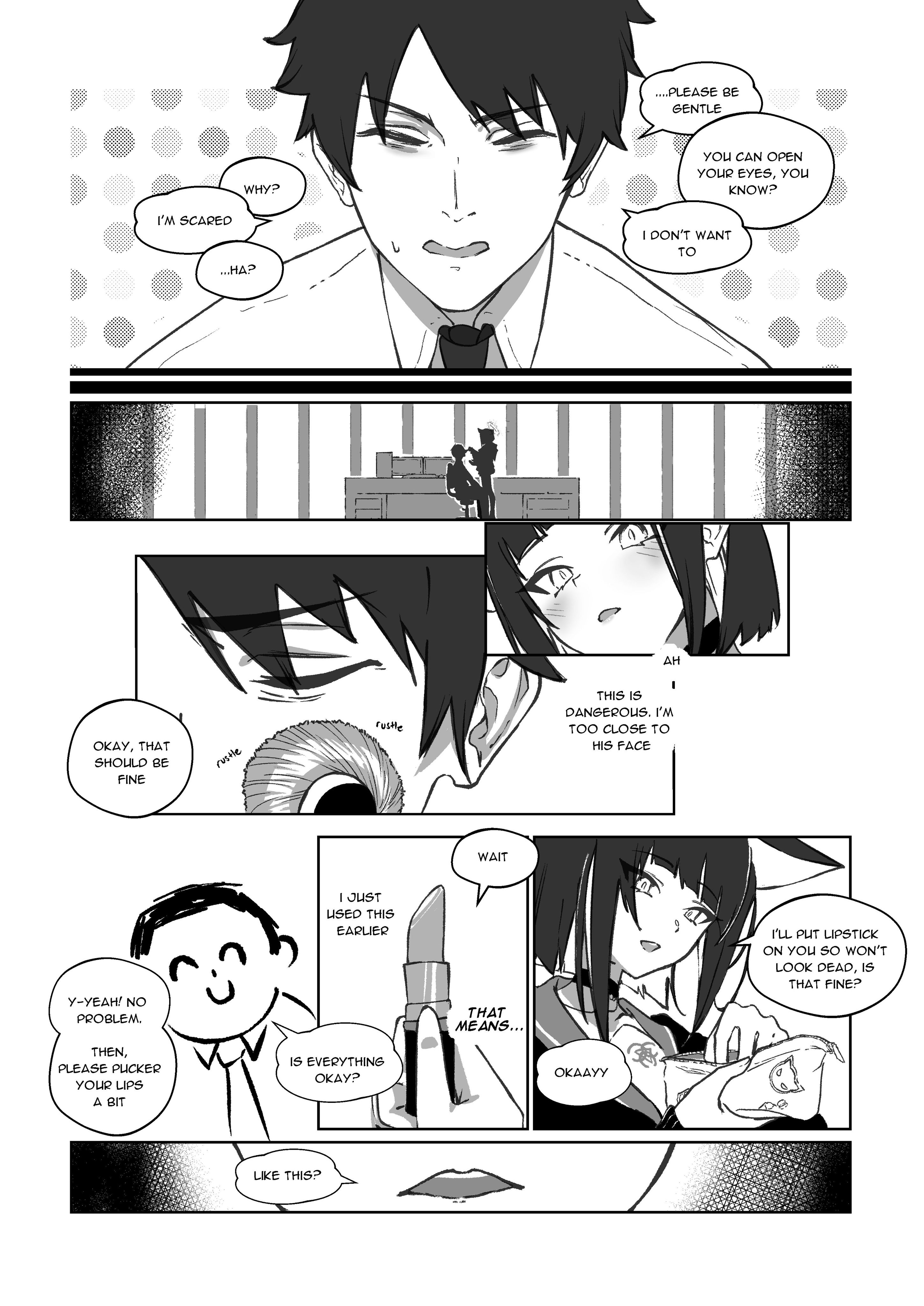 absurdres applying_makeup betanonbeet black_choker black_hair blue_archive blunt_bangs choker doodle_sensei_(blue_archive) embarrassed highres kazusa_(blue_archive) lipstick makeup makeup_brush medium_hair sailor_collar sensei_(blue_archive)