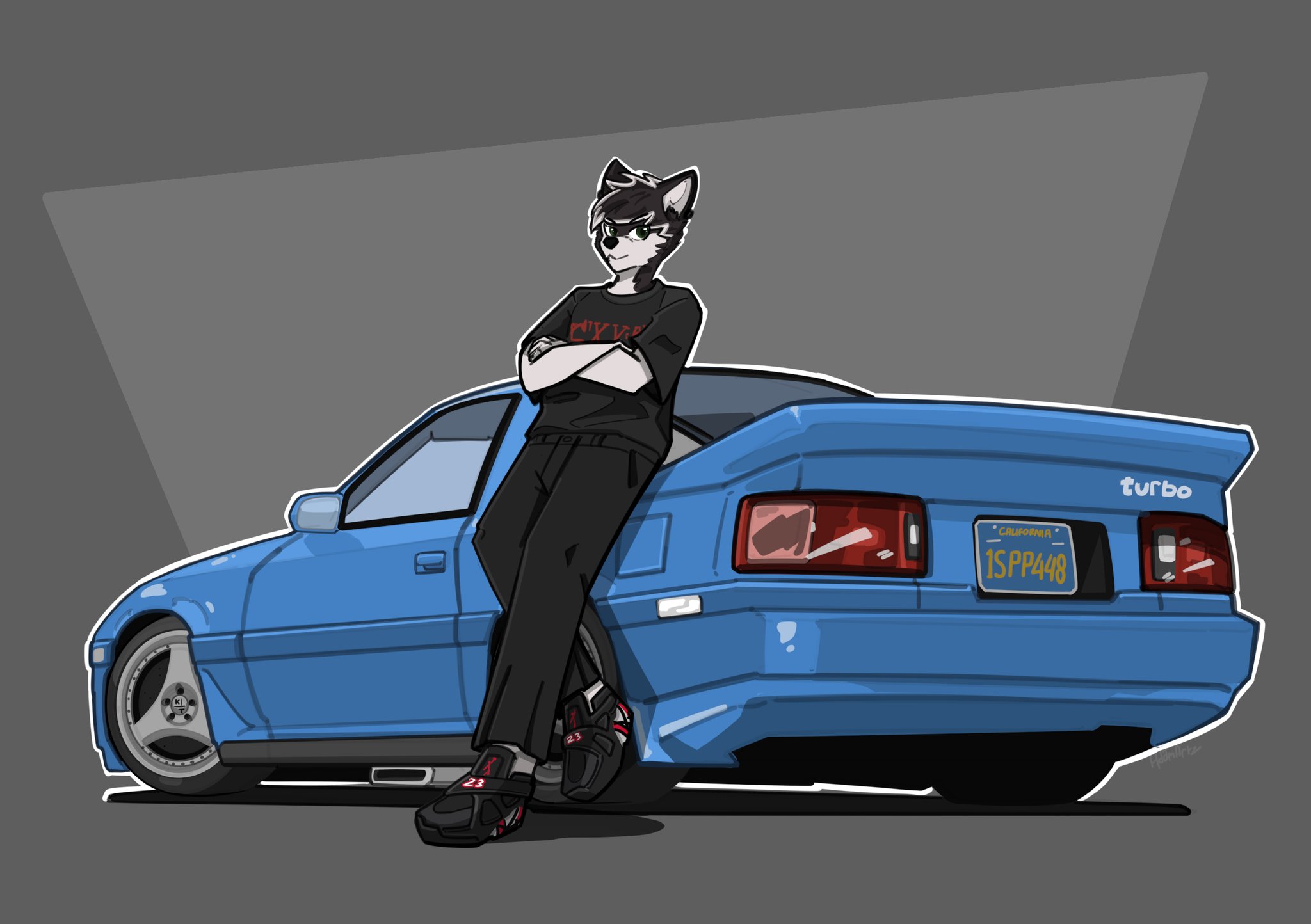 adamartz air_jordan animal_ears black_eyes black_footwear black_hair black_pants black_shirt blue_background blue_car car commission crossed_arms furry furry_male grey_background highres license_plate looking_to_the_side male_focus motor_vehicle original pants shadow shirt shoes smile sneakers sports_car toyota toyota_supra toyota_supra_mk_iii v-shaped_eyebrows vehicle_focus