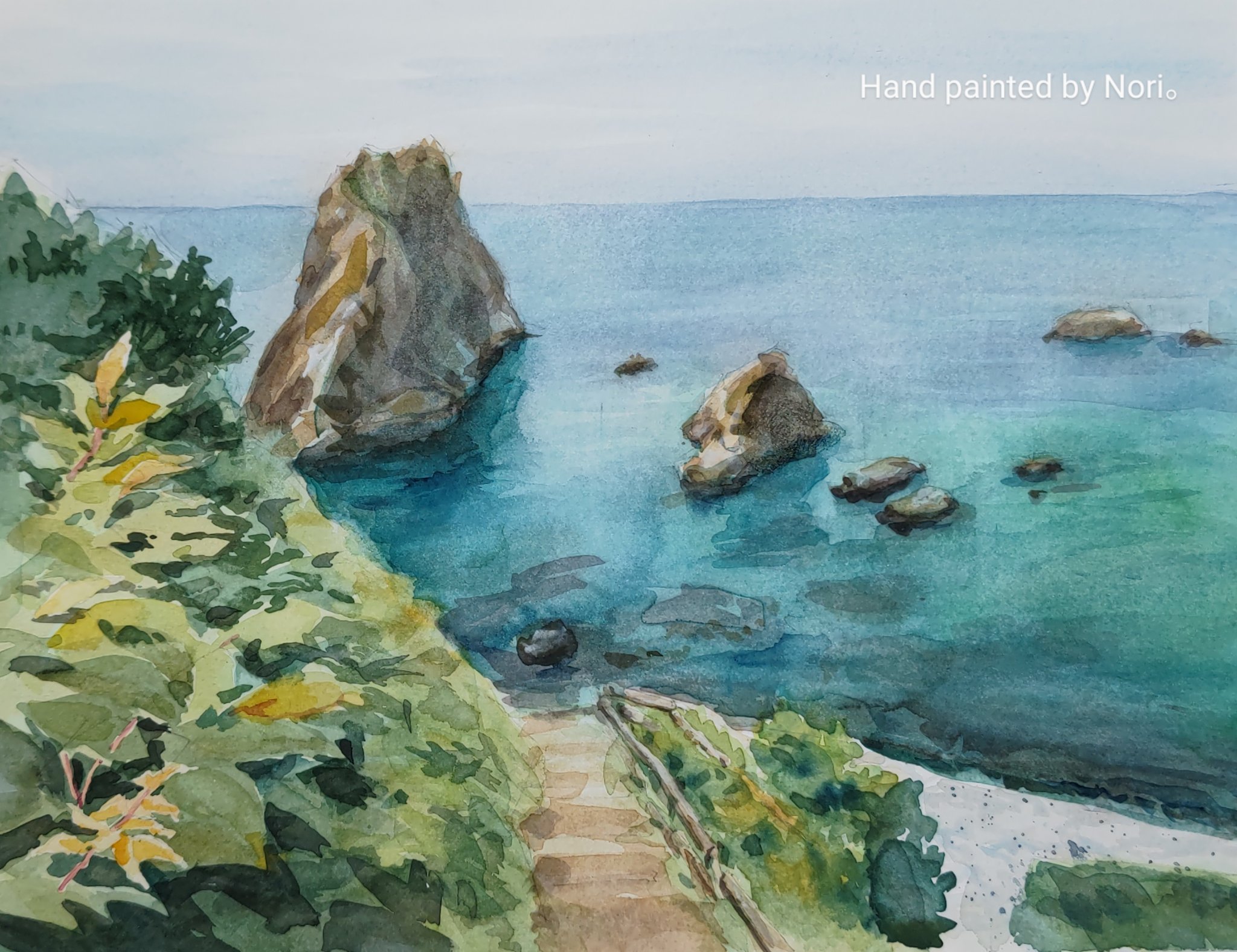 beach blue_sky bush cliff day fern highres horizon no_humans nori02222 ocean original painting_(medium) plant rock scenery shore sky traditional_media water watercolor_(medium)