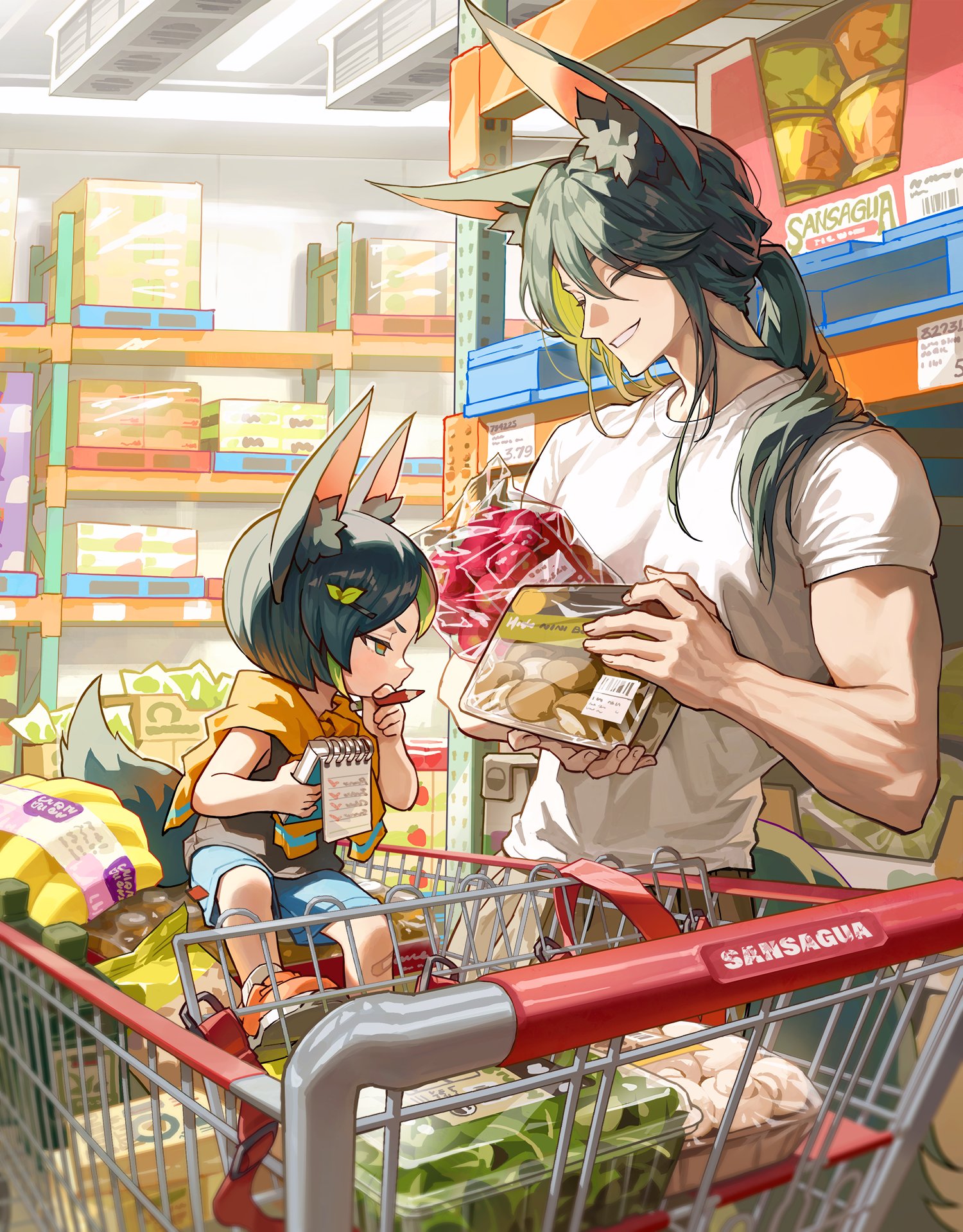 2boys animal_ear_fluff animal_ears black_hair black_tank_top blue_shorts brown_pants closed_eyes closed_mouth father_and_child father_and_son food fox_boy fox_ears fox_tail fruit genshin_impact green_eyes green_hair hair_between_eyes highres male_focus market multicolored_hair multiple_boys pants parent_and_child sansaguaart shirt shop shopping_cart short_hair shorts smile streaked_hair tail tank_top teeth tighnari's_father_(genshin_impact) tighnari_(genshin_impact) vegetable white_shirt