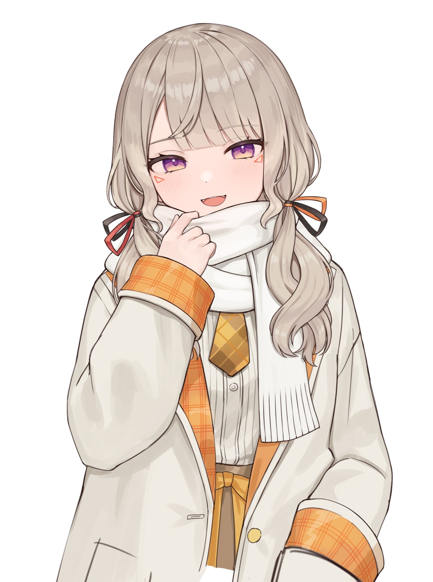 1girl blazer blunt_bangs buttons facial_mark grey_hair hair_ribbon hand_in_pocket hashtag-only_commentary highres jacket komori_met komori_met_(6th_costume) long_hair long_sleeves low_twintails multicolored_jacket necktie open_clothes open_jacket open_mouth orange_jacket orange_necktie plaid_clothes plaid_jacket plaid_necktie purple_eyes ribbon scarf shirt simple_background sn_kaze solo twintails upper_body virtual_youtuber vspo! white_background white_jacket white_scarf white_shirt