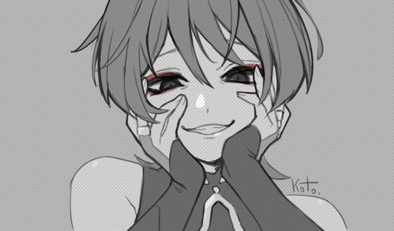 1boy artist_name bare_shoulders blank_eyes blunt_ends bodysuit bridal_gauntlets crazy_grin eyeliner eyeshadow facing_viewer genshin_impact grey_background grin hair_between_eyes hands_on_own_cheeks hands_on_own_face kotokate looking_at_viewer makeup male_focus male_yandere middle_ring monochrome red_eyeliner red_eyeshadow scaramouche_(genshin_impact) smile solo upper_body wanderer_(genshin_impact) yandere yandere_trance