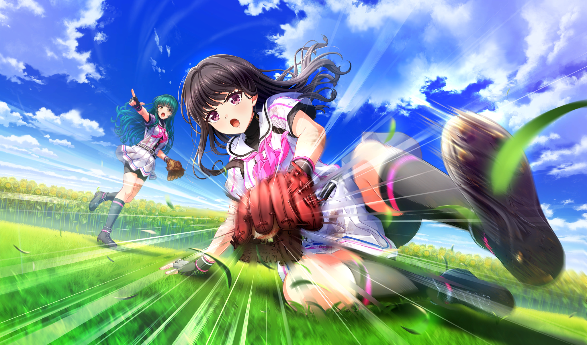 2girls ball baseball baseball_(object) baseball_field baseball_glove baseball_uniform belt belt_buckle bike_shorts bike_shorts_under_skirt black_belt black_footwear black_gloves black_hair black_shorts black_socks buckle catching cinderella_series cloud emphasis_lines field fingerless_gloves flower flower_field from_below game_cg gloves grass green_hair hachigatsu_no_cinderella_nine highres holding holding_ball kotomiya_chitose long_hair looking_ahead motion_blur multiple_girls nagai_kanako neckerchief non-web_source official_art on_ground open_mouth outdoors pink_neckerchief playing_sports pleated_skirt pointing pointing_forward purple_eyes satogahama_baseball_uniform shirt shirt_under_shirt short_sleeves shorts skirt sky socks solo_focus sportswear striped_belt striped_clothes striped_shirt sunflower sunflower_field undershirt vertical-striped_clothes vertical-striped_shirt wristband