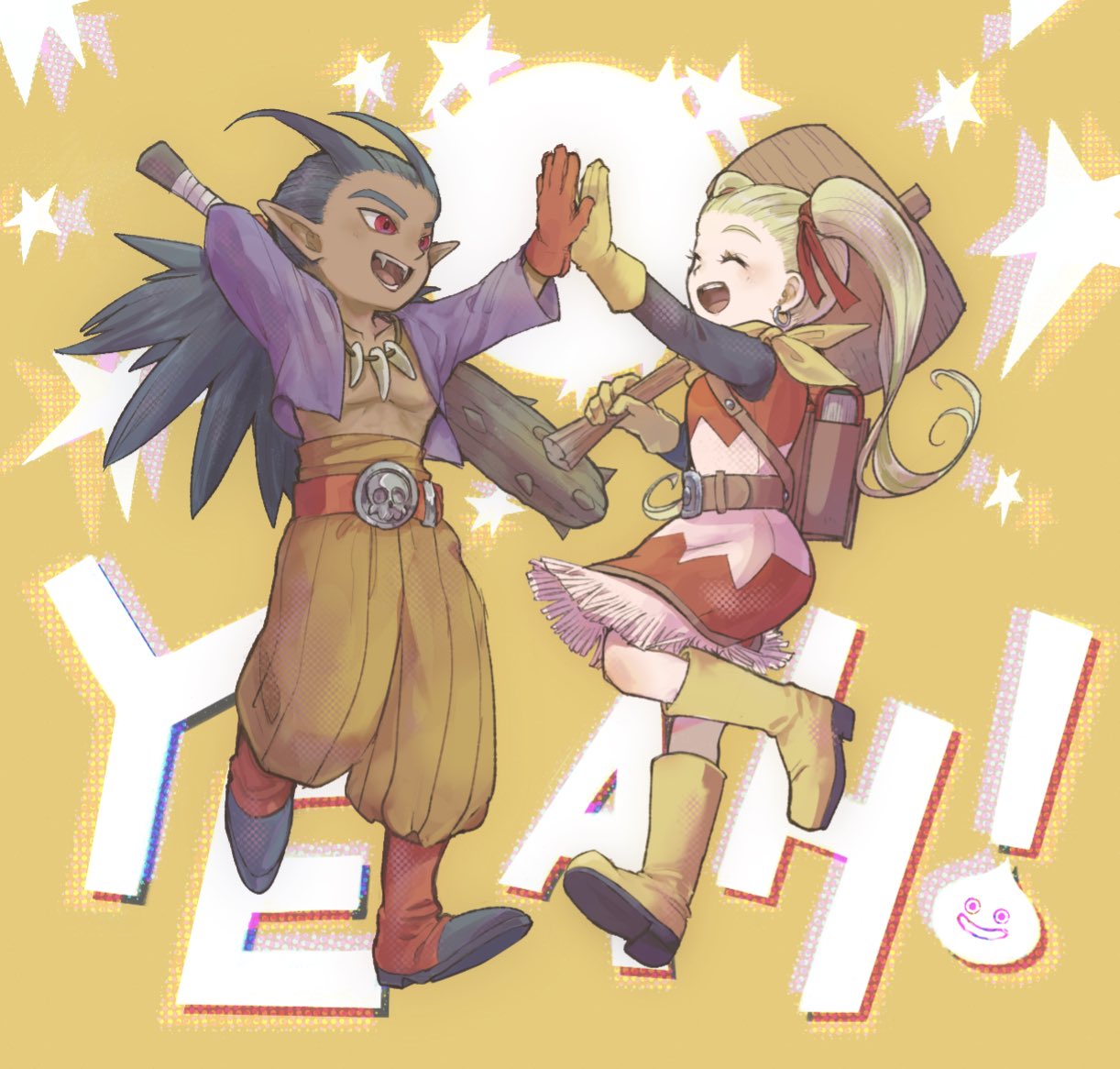 1boy 1girl antenna_hair belt black_hair blonde_hair bone_necklace boots closed_eyes club club_(weapon) commentary dark-skinned_male dark_skin dragon_quest dragon_quest_builders_2 dress earrings english_text fangs female_builder_(dqb2) floating_clothes floating_hair fringe_trim gloves hair_pulled_back hair_ribbon hammer hashtag-only_commentary high_five holding holding_club holding_hammer holding_weapon hoop_earrings jewelry leg_up looking_at_another low_ponytail matsuge_(gajigaji) neckerchief necklace open_clothes open_mouth open_shirt orange_pants pants pointy_ears ponytail purple_shirt red_belt red_eyes red_footwear red_gloves red_ribbon ribbon shirt sidoh_(dqb2) skull_belt slime_(dragon_quest) spiked_club spiked_hair star_(symbol) untranslatable_commentary tooth_necklace twintails weapon yellow_gloves yellow_neckerchief