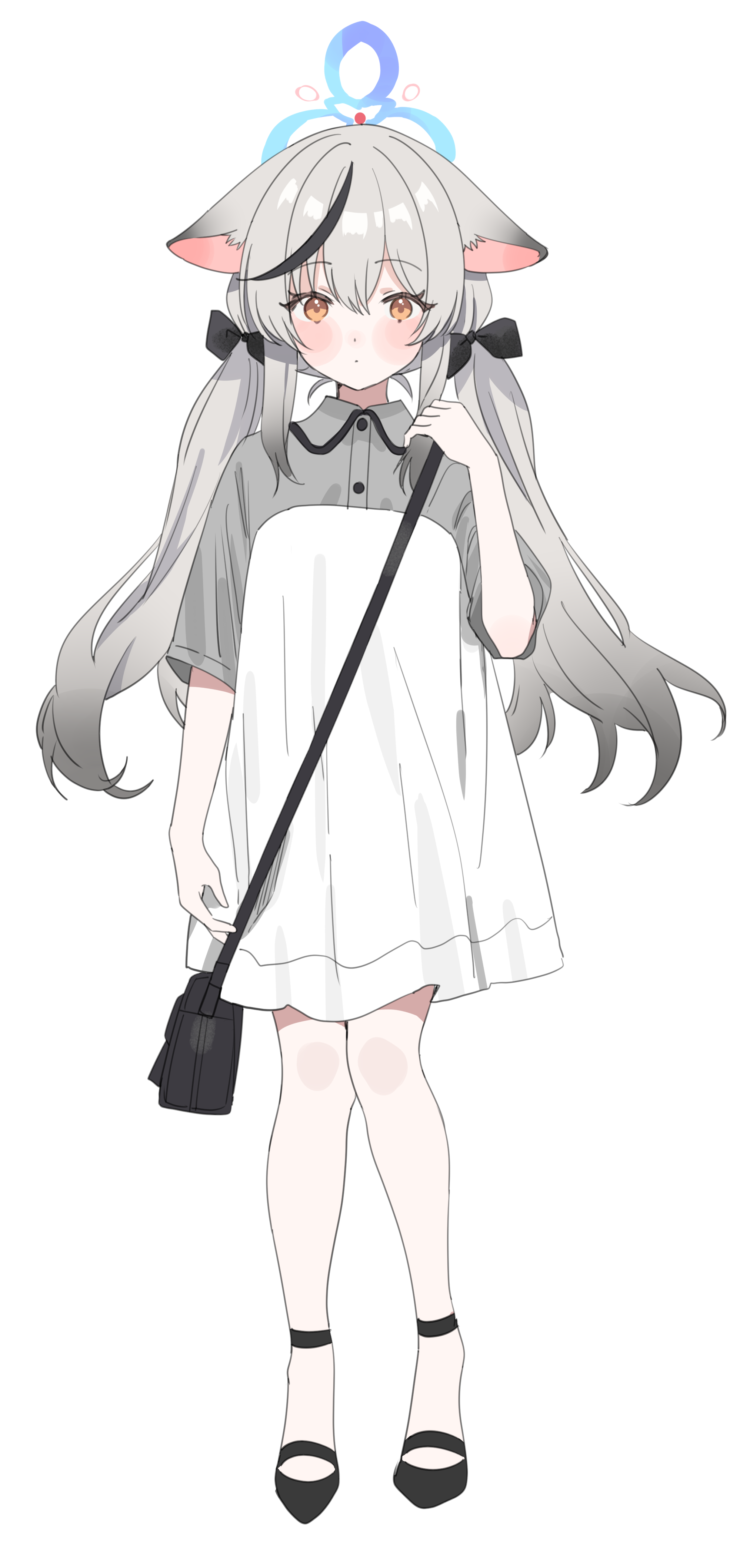 1girl absurdres animal_ears bag black_bag black_bow black_footwear black_hair blue_archive blue_halo bow closed_mouth collared_dress daredattakke dress full_body grey_hair hair_between_eyes hair_bow halo highres kokona_(blue_archive) long_hair looking_at_viewer multicolored_hair shoulder_bag simple_background solo standing streaked_hair twintails white_background white_dress yellow_eyes