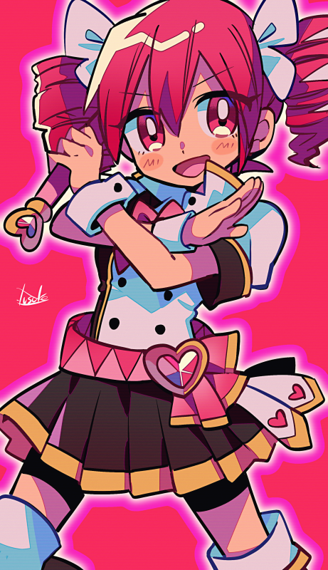 1girl belt bike_shorts bike_shorts_under_skirt black_dress boots bow bowtie buttons crossed_arms crossed_wrists double-breasted double-parted_bangs dress drill_hair gem hair_between_eyes hair_bow hair_ribbon hands_up kasane_teto kasane_teto_(sv) magical_girl pleated_dress red_background red_bow red_bowtie red_eyes red_hair ribbon signature solo synthesizer_v thigh_boots twin_drills utau white_bow white_dress white_ribbon white_wrist_cuffs wrist_cuffs yuusuke-kun