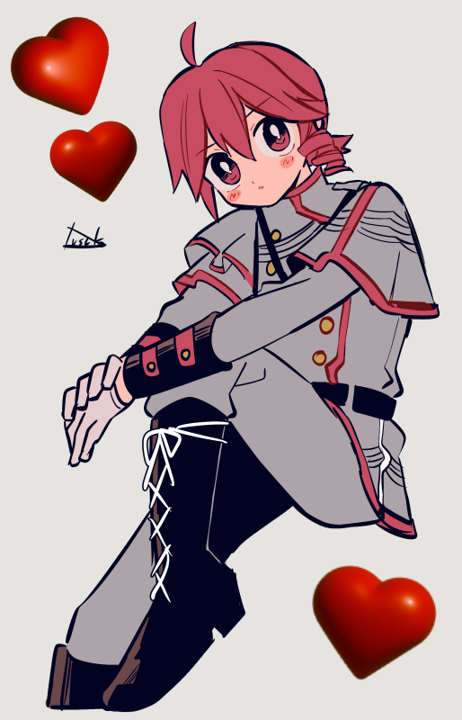 1boy ahoge black_boots blush boots buttons closed_mouth double-breasted double-parted_bangs drill_hair foot_out_of_frame genderswap genderswap_(ftm) gloves grey_background grey_jacket grey_pants hair_between_eyes heart invisible_chair jacket kasane_ted kasane_teto kasane_teto_(sv) knee_boots lace-up_boots leg_up looking_at_viewer own_hands_together pants red_hair red_trim side_drill signature simple_background sitting sleeve_cuffs striped_clothes striped_jacket synthesizer_v utau white_gloves yuusuke-kun