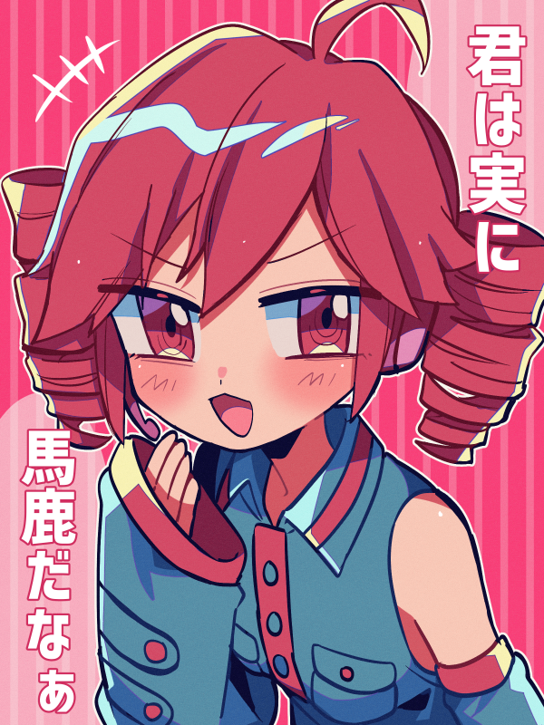 1girl ahoge black_sleeves blush collared_shirt detached_sleeves double-parted_bangs drill_hair hair_between_eyes hand_up headphones headset kasane_teto kasane_teto_(utau) long_sleeves microphone open_mouth pocket red_background red_eyes red_hair red_trim shirt sleeveless sleeveless_shirt solo striped_background translation_request twin_drills upper_body utau wing_collar yuusuke-kun