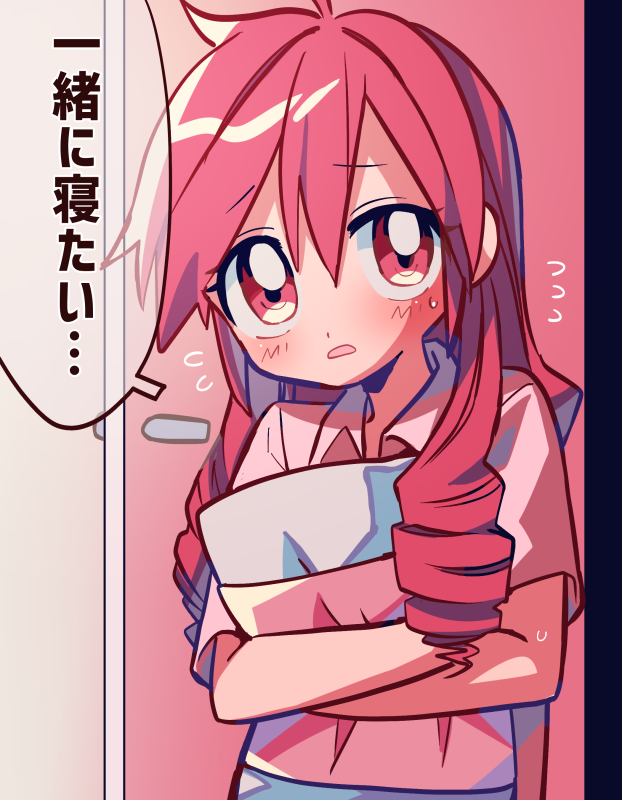 ahoge alternate_costume alternate_hairstyle blush collared_shirt door drill_hair flying_sweatdrops hand_up holding holding_pillow indoors kasane_teto open_mouth pillow red_hair shirt short_sleeves speech_bubble sweat translation_request twin_drills upper_body utau wing_collar yuusuke-kun