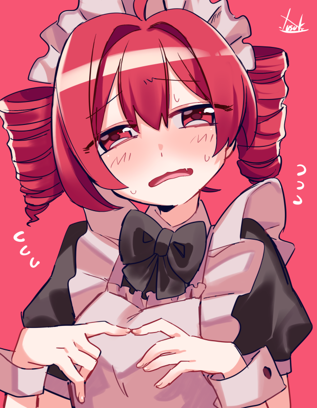1girl ahoge alternate_costume apron black_bow black_bowtie blush bow bowtie buttons close-up dress drill_hair enmaided fang fidgeting fingernails flying_sweatdrops frills kasane_teto maid maid_apron maid_headdress open_mouth red_hair short_sleeves signature solo sweat tongue twiddling_fingers twin_drills utau wrist_cuffs yuusuke-kun