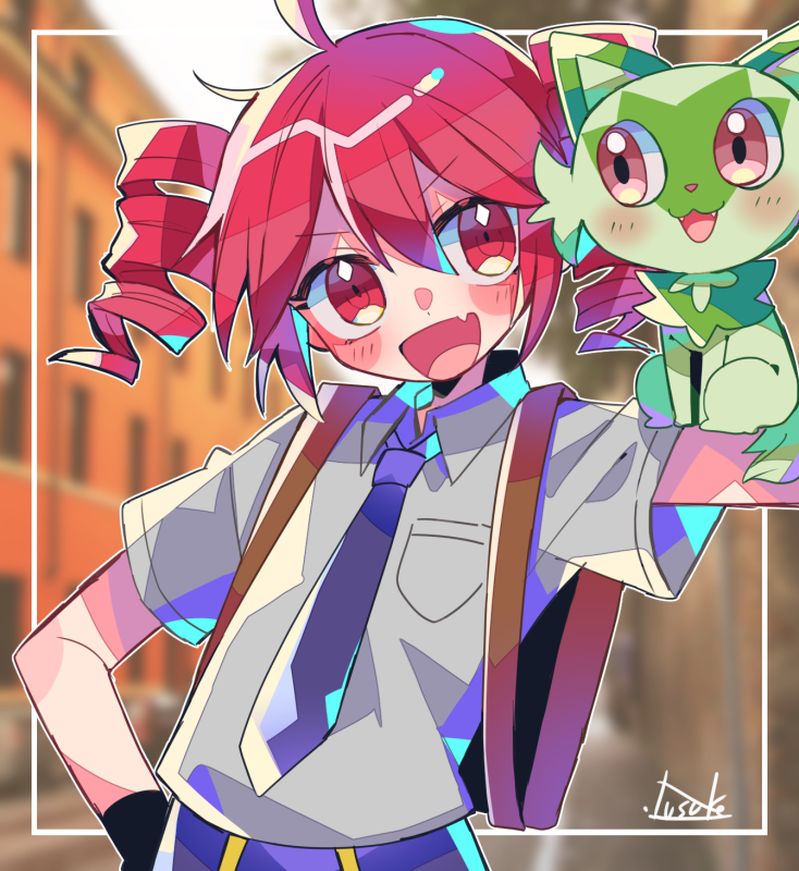 ahoge alternate_costume alternate_universe backpack bag blush building cat collared_shirt double-parted_bangs drill_hair fang hair_between_eyes hand_on_own_hip kasane_teto looking_at_another looking_at_viewer necktie nintendo outdoors pocket pokemon pokemon_(creature) pokemon_scarlet_and_violet purple_necktie red_eyes red_hair shirt short_sleeves signature skin_fang sprigatito tongue twin_drills upper_body utau white_shirt wing_collar yuusuke-kun