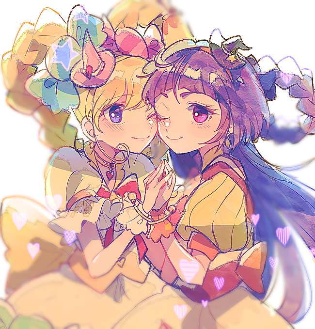 2girls ;) asahina_mirai blonde_hair blue_eyes braid closed_mouth cure_magical cure_magical_(topaz_style) cure_miracle cure_miracle_(topaz_style) dress folded_twintails hand_to_hand hat itomugi-kun izayoi_liko long_hair mahou_girls_precure! mini_hat mini_witch_hat multiple_girls one_eye_closed pink_hat precure purple_hair red_eyes short_sleeves sketch smile twin_braids twintails very_long_hair white_background witch_hat yellow_dress
