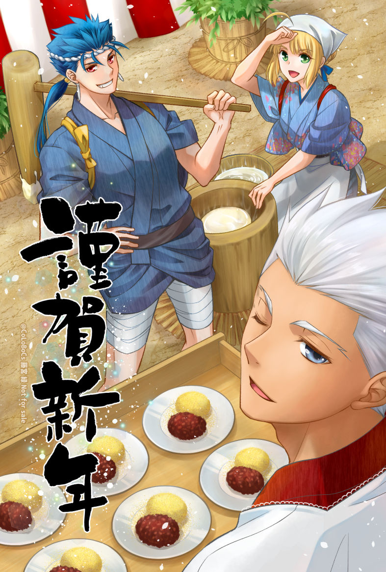 1girl 2boys ahoge alternate_costume apron archer_(fate) artoria_pendragon_(fate) blonde_hair blue_eyes blue_hair blue_kimono braid cu_chulainn_(fate) cu_chulainn_(lancer)_(fate) dark-skinned_male dark_skin earrings fate/stay_night fate_(series) food_request green_eyes grin hair_bun hair_ribbon hand_on_own_hip headscarf headwear_request holding japanese_clothes jewelry kimono kine long_hair long_sleeves looking_at_viewer male_focus mallet mochitsuki mortar_(bowl) multiple_boys one_eye_closed open_mouth ponytail red_eyes ribbon rinrinri_(fujimiya) saber_(fate) short_hair smile tasuki tenugui translation_request white_apron white_hair