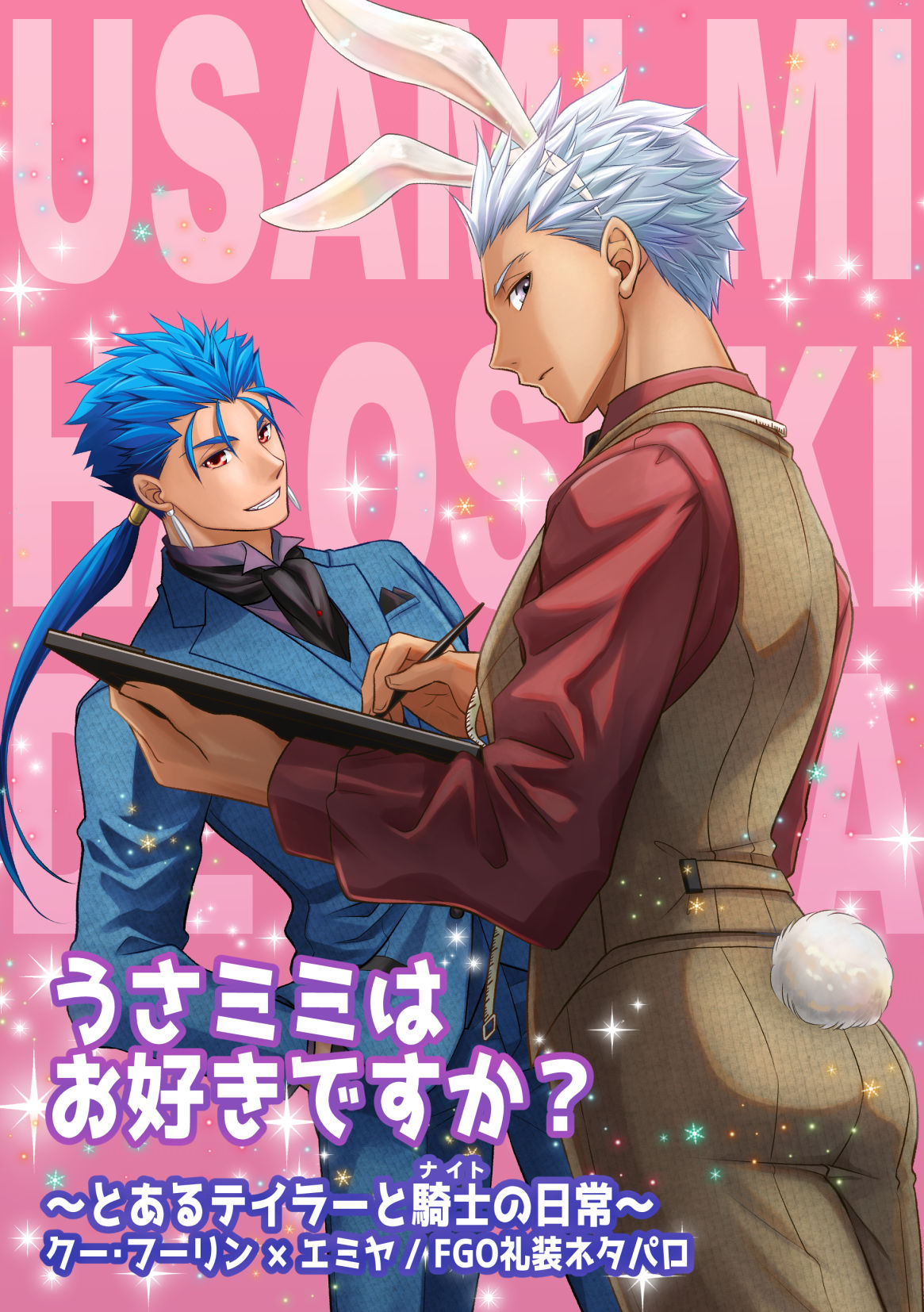 2boys animal_ears archer_(fate) ascot black_ascot blue_hair blue_suit brown_pants brown_vest clipboard cu_chulainn_(fate) cu_chulainn_(lancer)_(fate) dark-skinned_male dark_skin earrings fake_animal_ears fake_tail fate/stay_night fate_(series) formal_clothes grin hands_in_pockets highres holding holding_clipboard jewelry long_hair looking_at_viewer male_focus multiple_boys pants ponytail rabbit_ears rabbit_tail red_eyes red_shirt rinrinri_(fujimiya) shirt short_hair smile sparkle suit tail tape_measure translation_request vest white_hair