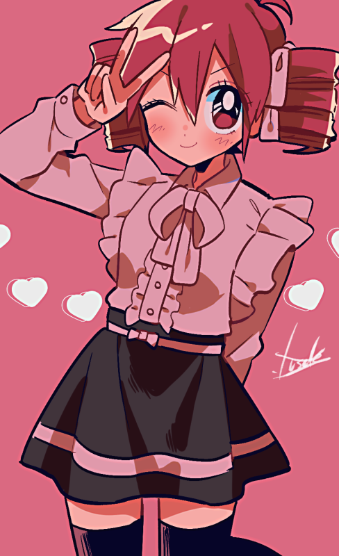 ahoge alternate_costume black_skirt black_thighhighs bow bowtie buttons collared_shirt drill_hair frilled_shirt frills hair_ribbon heart kasane_teto kasane_teto_(sv) pink_bow pink_bowtie pink_ribbon pink_shirt pink_trim red_hair ribbon shirt signature skirt synthesizer_v thighhighs twin_drills utau v wing_collar yuusuke-kun zettai_ryouiki