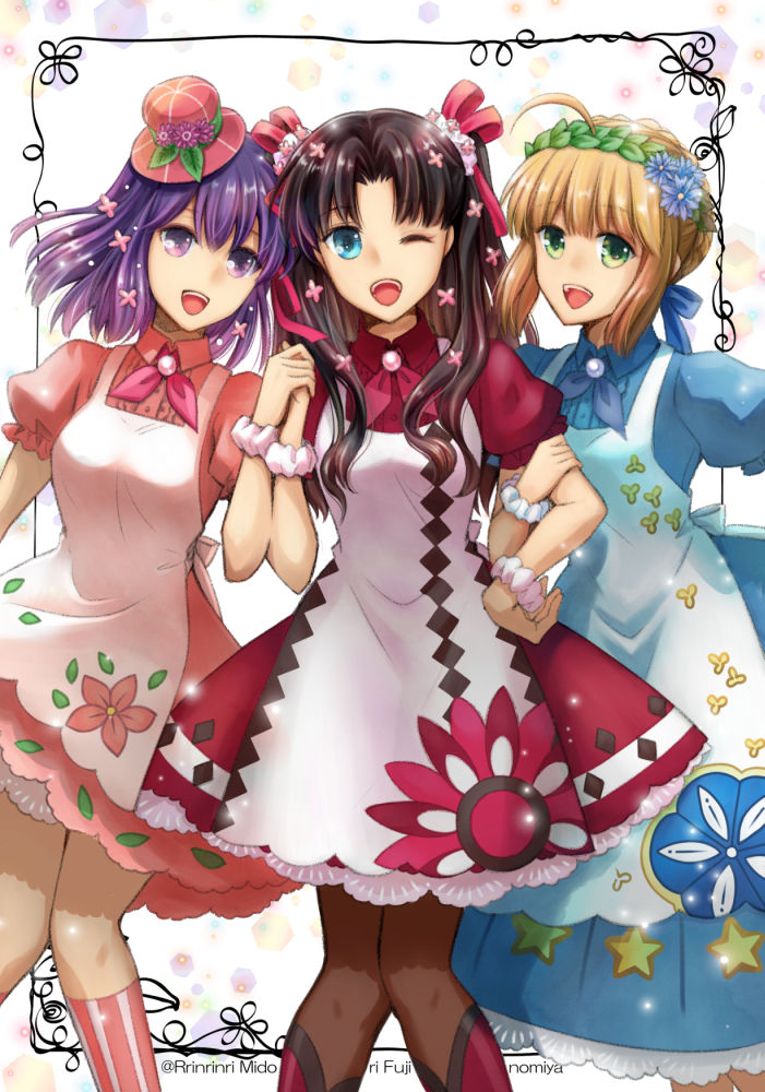 3girls ahoge alternate_costume apron artoria_pendragon_(fate) black_hair blonde_hair blue_eyes braid brooch collared_dress cross_tie dress fate/stay_night fate_(series) flower green_eyes hair_between_eyes hair_flower hair_ornament hair_ribbon hat holding_hands jewelry locked_arms long_hair looking_at_viewer matou_sakura mini_hat multiple_girls no_nose open_mouth pink_hat puffy_short_sleeves puffy_sleeves purple_eyes purple_hair ribbon rinrinri_(fujimiya) saber_(fate) scrunchie short_hair short_sleeves sidelocks smile tohsaka_rin two_side_up wrist_scrunchie