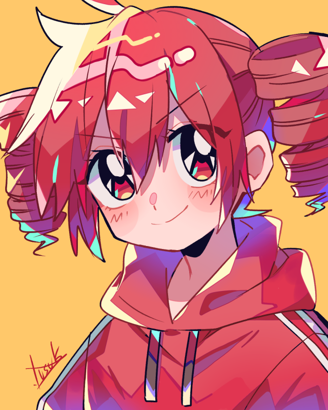 1girl ahoge alternate_costume close-up double-parted_bangs drill_hair hair_between_eyes hood hooded_sweater kasane_teto looking_at_viewer red_hair signature simple_background smile solo sweater twin_drills utau white_trim yellow_background yuusuke-kun